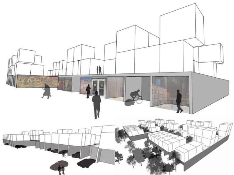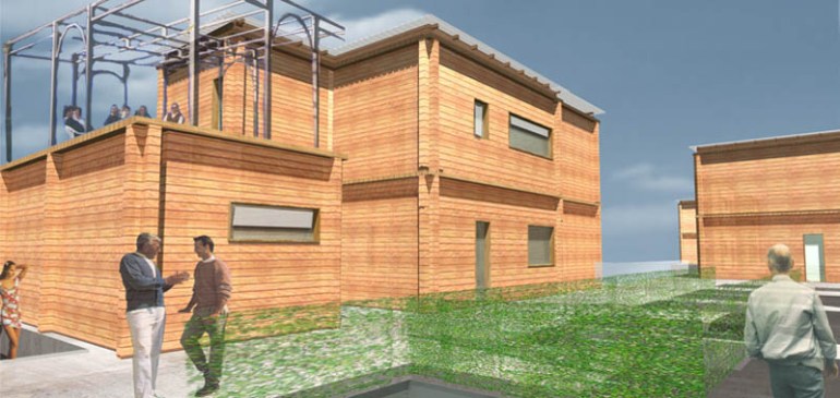 Il nocciolo, il core dal quale scaturisce l’intero sistema, si basa sull’unità abitativa definita nella sua molteplice aggregazione come case-albero: queste sono costruite in legno massiccio per mezzo di una tecnologia prefabbricata di uso comune e di facile assemblaggio detta “blockbau”; lo sviluppo ed il moltiplicarsi successivo di queste unità crea un bosco artificiale dalla geometria mutevole la cui immagine definitiva non può essere controllata dal progetto ma viene a definirsi attraverso gli interventi degli inquilini stessi; il bosco poggia e distende le sue radici nell’ampio basamento di cemento armato, le isole, nel quale trovano alloggio il primo sistema di appartamenti simplex ed i servizi (attività commerciali, negozi, spazi ricreativi etc.).