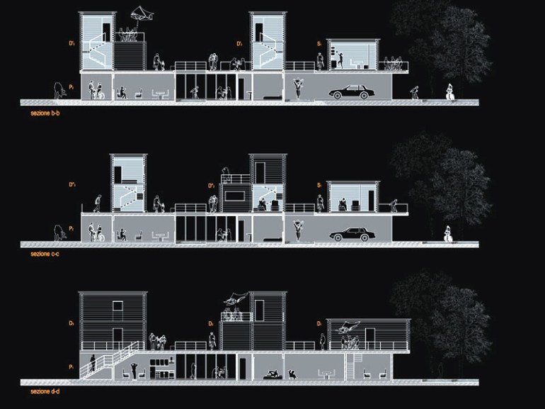 Le isole, a loro volta, crescendo di numero compongono un vero e proprio arcipelago, una struttura articolata composta da diverse unità autosufficienti ma in stretta relazione tra loro. La nostra proposta prevede la realizzazione di 4 distinte isole tra loro collegate per mezzo di percorsi in quota che si affacciano alternativamente verso la città e verso lo spazio abitato, permettendo così di stabilire un rapporto più saldo tra l’ambiente circostante ed il sistema insediativo previsto. Gli spazi esterni al livello del terreno vengono destinati a verde privato ed a parcheggio, si prevedono inoltre percorsi pedonali e carrabili per garantire il collegamento più agevole possibile con l’esterno.