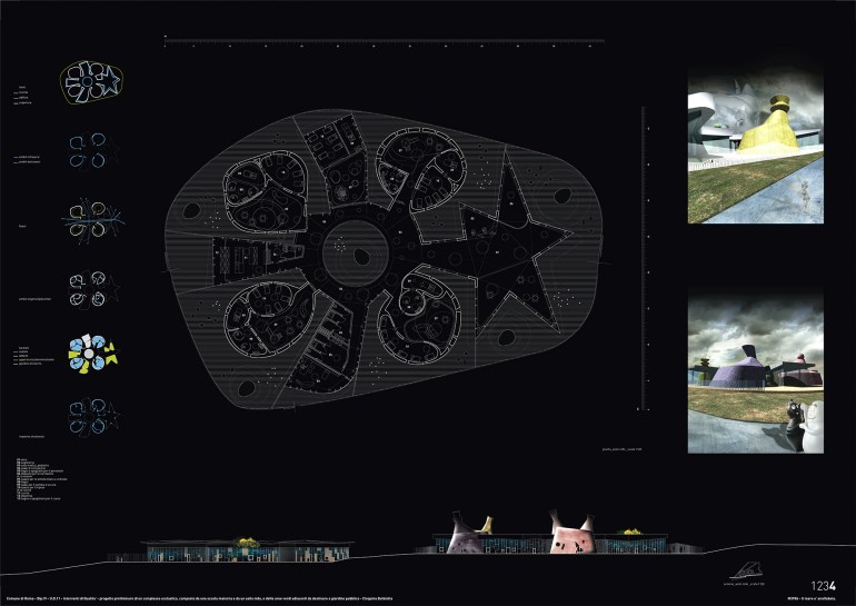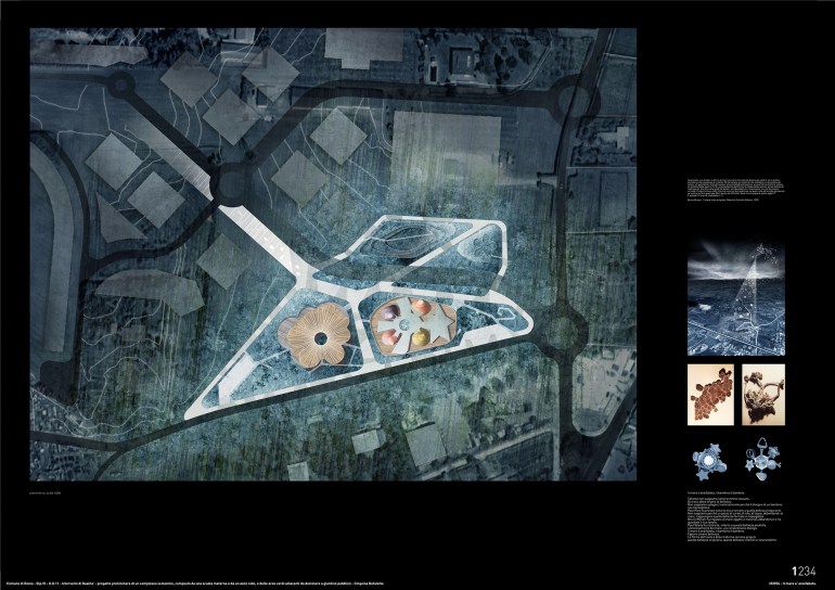 Il progetto proposto tiene conto del contesto urbano futuro in cui è chiamato ad inserirsi: questo può essere interpretato come una sorta di microcosmo autosufficiente – una città nella città – dove abitazione, verde, spazi destinati al commercio ed alla infrastruttura si immagina possano costituire un sistema attivo e dinamico. Interpretare questa futura configurazione urbana come una sorta di grado zero della pianificazione, che possa vedere come fuoco e centro ideale del suo farsi il bambino, permette di elaborare una nuova strategia di crescita che sostanzialmente guarda ad un modello di architettura equilibrato e commisurato alle esigenze specifiche di una società in cui i più piccoli possano crescere, acquisire nozioni, sviluppare socialità ed esperienza attraverso il contatto e la vicinanza con giovani ed anziani, piccoli e grandi laddove l’architettura conforma e favorisce trasmissione di sapere e di vita, come fiume che scorre o sole che irradia incessante. Il progetto si pone l’obiettivo di costruire un habitat nel suo complesso familiare accogliente e giocoso.