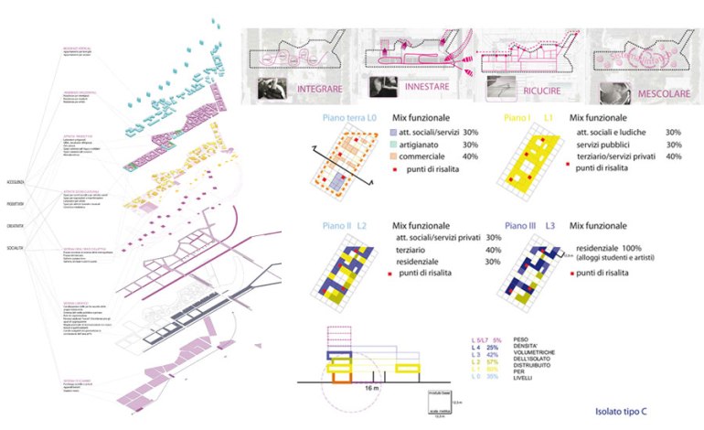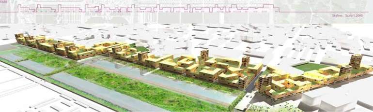 Realizzare un progetto urbano di qualità, riconvertendo a nuova vita uno spazio urbano semi-abbandonato, come l’area di Scalo Vanchiglia, vuole dire innanzitutto riflettere molto concretamente su un programma sociale che possa incidere in maniera significativa sui caratteri dello spazio pubblico, sul sistema di relazioni umane che vi si svolgeranno, e quindi sull’architettura. In questo senso un grande progetto di riqualificazione urbana -come quello ipotizzato per Scalo Vanchiglia – deve porre con forza al primo punto la questione della ri-costruzione della identità del nuovo quartiere cercando di definire il senso e il ruolo urbano che quest’area avrà nello spazio più ampio della città di Torino; Partendo da queste considerazioni generali la proposta progettuale intende proporre la trasformazione dell’area di Scalo Vanchiglia in un nuovo scalo fluviale tra la città di Torino e il Po che la attraversa, un grande “molo multietnico”, approdo delle culture e delle arti del Mondo. L’area di Scalo Vanchiglia è infatti storicamente un’area di “approdo” – scalo merci, accoglienza immigrati, centro giovanile- una identità che la proposta progettuale intende confermare ed aggiornare. Lo scalo ha perso nel tempo la sua funzione principale e rischia- con il processo di trasformazione in atto- di perdere la sua identità. L’infrastruttura ferroviaria è stata dismessa. L’area si è trasformata in un grande cul de sac sconnesso con il resto della città. La presenza della nuova metropolitana -rete passante- tenderà a modificare fortemente- il senso di questo luogo. Noi riteniamo viceversa che l’identità storico culturale dell’area di Scalo Vanchiglia, oggi unanimemente percepita come elemento in crisi, possa diventare il punto di forza e l’innesco per la definizione del programma socio-economico del nuovo quartiere. La particolare ubicazione dell’area dello Scalo Vanchiglia, la contiguità del Po e della Stura (ad Est) e della Dora (ad Ovest) hanno suggerito di restituire alla città di Torino – in questo particolare quadrante – un grande affaccio fluviale- fino a oggi negato dalla città moderna e contemporanea e ristretto a poche significative occasioni in quella storica – molto apprezzate dai cittadini torinesi-: il Parco del Valentino, La Piazza Vittorio Veneto, i Murazzi del Po. Altre progettualità poi, come quella del nuovo insediamento universitario all’ex Manifattura Tabacchi e nell’area dell’ex Italgas lungo la Dora, arricchiscono il tema ambientale delle fasce fluviali con progettualità insediative e urbane di livello metropolitano, in cui davvero i fiumi acquistano un ruolo centrale nel miglioramento di una diffusa qualità dell’abitare.