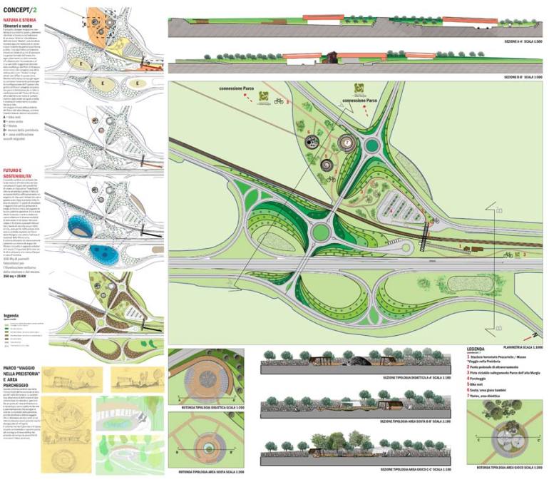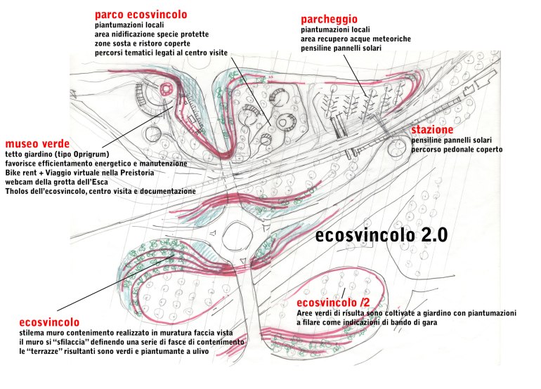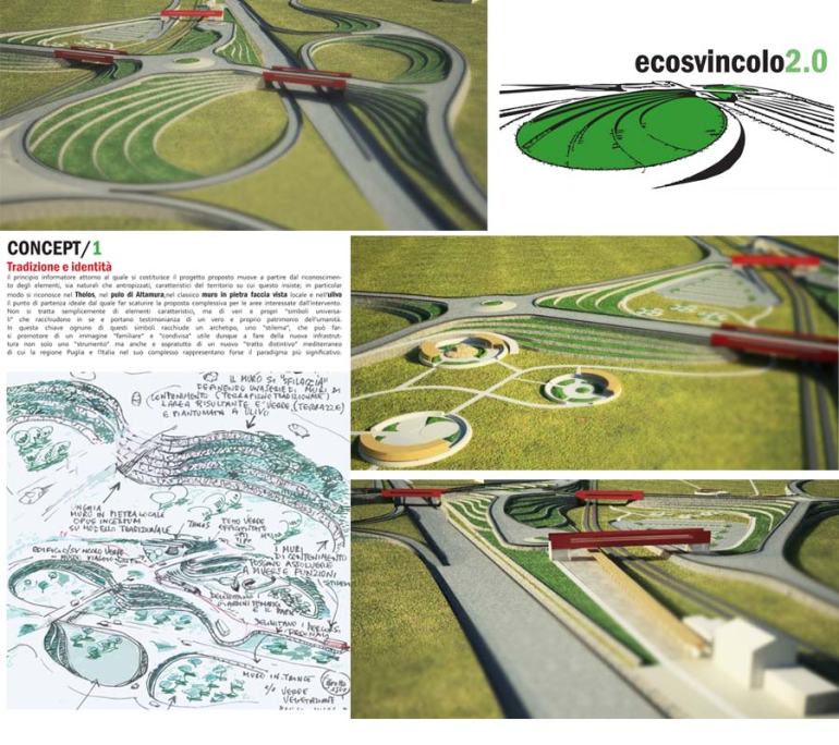il principio informatore attorno al quale si costituisce il progetto proposto muove a partire dal riconoscimento degli elementi, sia naturali che antropizzati, caratteristici del territorio su cui questo insiste; in particolar modo si riconosce nel Tholos, nel pulo di Altamura,nel classico muro in pietra faccia vista locale e nell’ulivo il punto di partenza ideale dal quale far scaturire la proposta complessiva per le aree interessate dall’intervento.Non si tratta semplicemente di elementi caratteristici, ma di veri e propri “simboli universali” che racchiudono in se e portano testimonianza di un vero e proprio patrimonio dell’umanità. In questa chiave ognuno di questi simboli racchiude un archetipo, uno “stilema”, che può farsi promotore di un immagine “familiare” e “condivisa” utile dunque a fare della nuova infrastruttura non solo uno “strumento” (dotato di una sua reale funzionalità) ma anche e sopratutto di un nuovo “tratto distintivo” mediterraneo di cui la regione Puglia e l’Italia nel suo complesso rappresentano forse il paradigma più significativo. Dunque e a partire dalla necessità di esaltare e implementare all’interno della proposta questo enorme potenziale che si è deciso di appropriarsi per ognuno dei suddetti elementi di una “proprietà” formale e costruttiva. La morfologia del Pulo ad esempio è sembrata fin dall’inizio molto vicina alle ampie curvature dei raggi dello Svincolo n°2, curvature che a questo punto potevano adottare nel loro svelarsi il tradizionale sistema realizzativo dei muri di divisione fondiaria in pietra locale. Allo stesso modo mossi dalla necessità di “normalizzare” l’accesso alla grotta dell’Elsa è sembrato efficace riproporre forma e la materialità del tholos in prossimità della stazione ferroviaria di Pescariello.