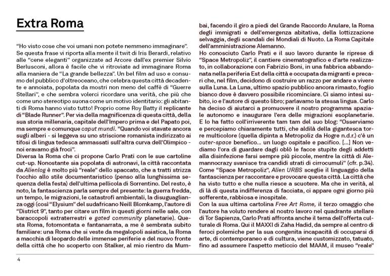 Una Roma che si veste da megalopoli asiatica, la Roma a macchia di leopardo delle immense periferie e del nuovo fronte della città, la Roma dei migranti e dell’emergenza abitativa, della lottizzazione selvaggia, degli scandali dei Mondiali di Nuoto. La Roma Capitale dell’amministrazione Alemanno. Una Roma piena di astronavi, quella di Alienlog, ma non per questo meno reale. Alien URBS sceglie il linguaggio della fantascienza per raccontare e provocare questa città. La città che ha visto tutto e che nulla riesce a scuotere. Ma che in verità, al di là di questa indifferenza di facciata, ci appare ogni giorno più sofferente, rabbiosa e inospitale. (estratto dalla prefazione di Giorgio de Finis)