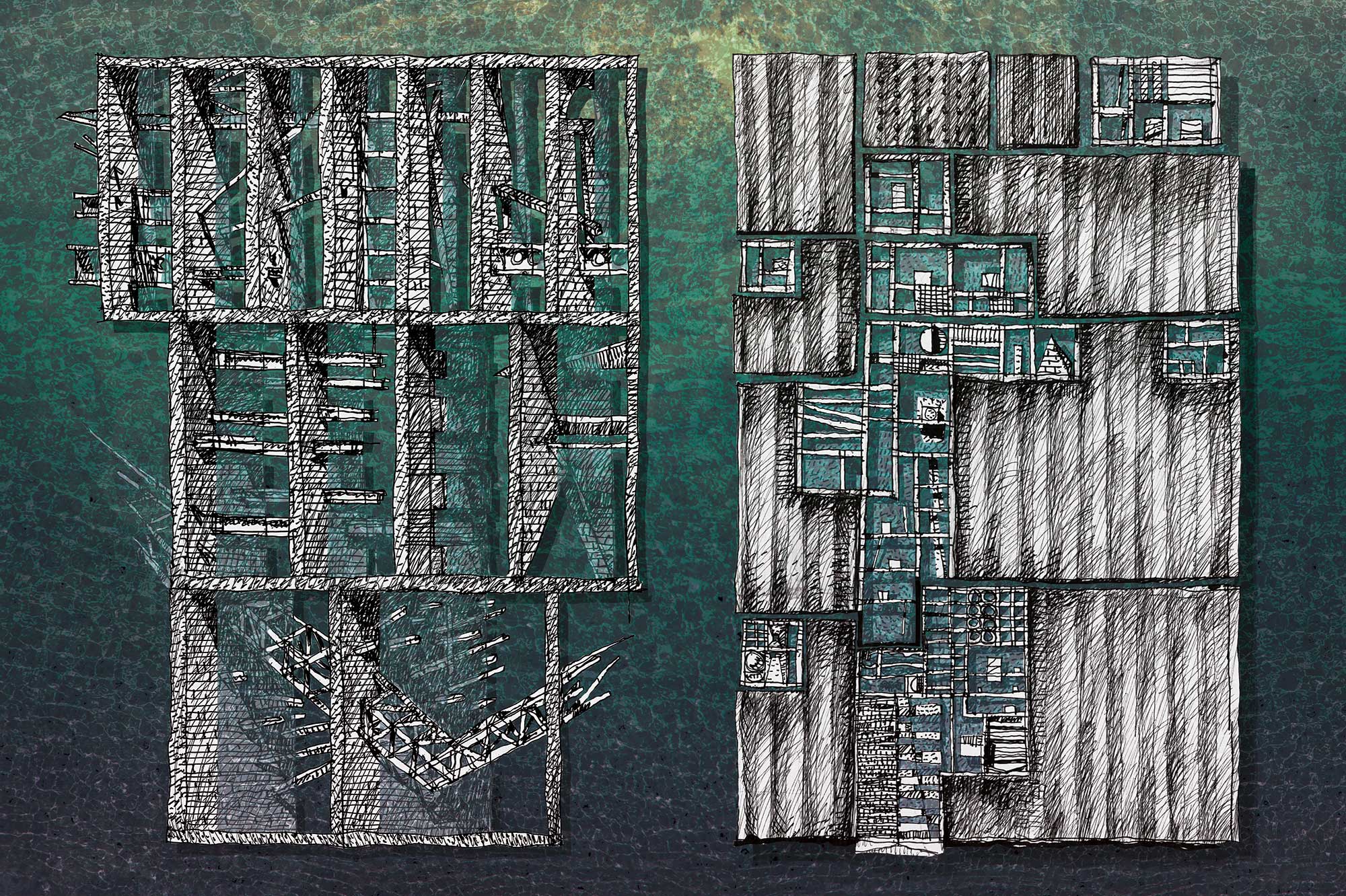 C.P. Atlantide è una riflessione sulla rappresentazione e sui modus operandi canonici (sezione, pianta, prospetto, prospettiva centrale) che abbiamo a disposizione e che usiamo talvolta in modo pedissequo e automatico.