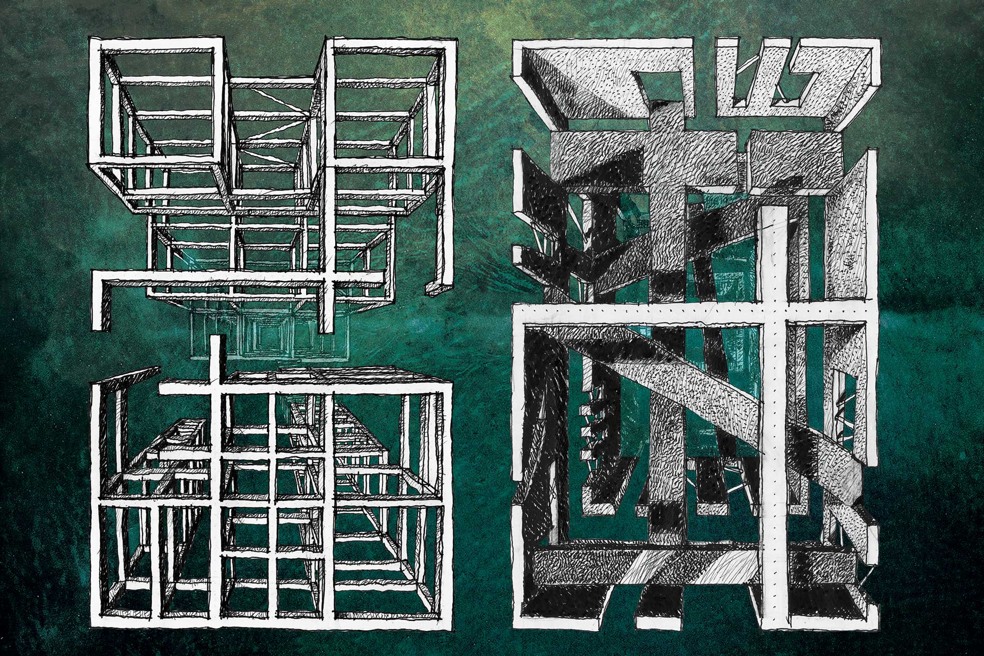 Nello spazio dell’Acquario Romano ho immaginato queste 4 tavole in sequenza che hanno come comune denominatore l’acqua, attraverso di essa si guarda all’interno di concrezioni tettoniche fantastiche; ci sono dei punti di partenza, delle suggestioni, dei riferimenti alle opere di Steven Holl, Le Corbusier e Franco Albini, che ho rivisitato alla mia maniera, secondo il mio personale sentire.