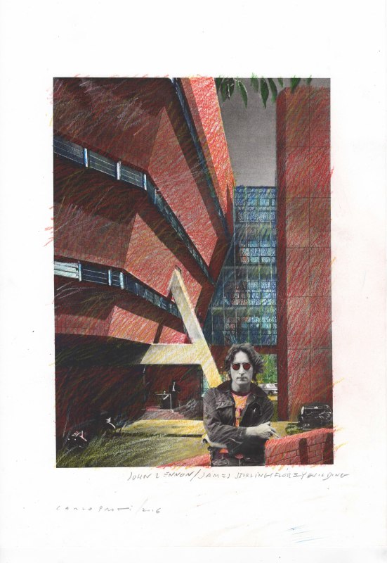JAMES, GEORGE, JOHN & PAUL (drawings series 2016) 0 27 aprile 201623 luglio 2020 Written by Carlo Prati Carlo Prati. George Harrison at James Stirling’s Brunswick Primary School. Tecnica mista, 30×40 cm. 2016 Carlo Prati. John Lennon James Stirling’s Florey Building. Tecnica mista 30×40 cm. 2016 Carlo Prati. Ringo Starr at James Stirling’s Leicester Engineering Building Tecnica mista 30×40 cm. 2016 Condividi:TweetCondividi su TumblrMi piace Caricamento... Correlati