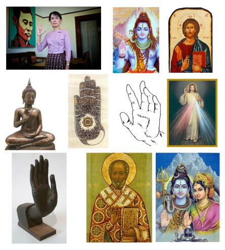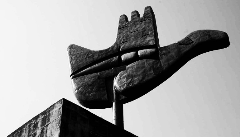 La Main Ouverte1, il cuore “iconografico” e “simbolico” della visione di Le Corbusier a Chandigarh è secondo la mia interpretazione una Mudra, un gesto simbolico del corpo che indica sentimenti o intenti religiosi specifici. Di più, la Main Ouverte è un Abhaya Mudra, il sigillo che le divinità compiono per simboleggiare le loro abilità protettive. Abhaya è infatti Coraggio: la mano destra alzata all’altezza della spalla, il braccio piegato e il palmo rivolto verso l’esterno con le dita unite in posizione verticale. Rappresenta la protezione, la benevolenza e la vittoria sulla paura. Abhaya Mudra è il gesto della pace comune a tutte le religioni e grandi tradizioni spirituali (Induista, Buddhista, Cristiana e Mussulmana).