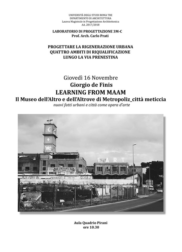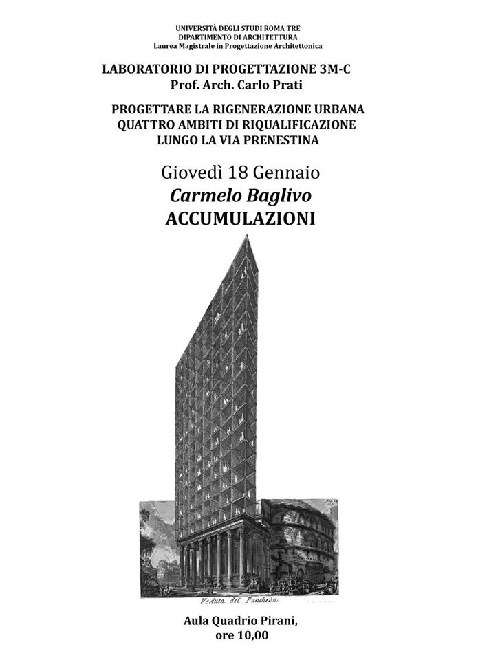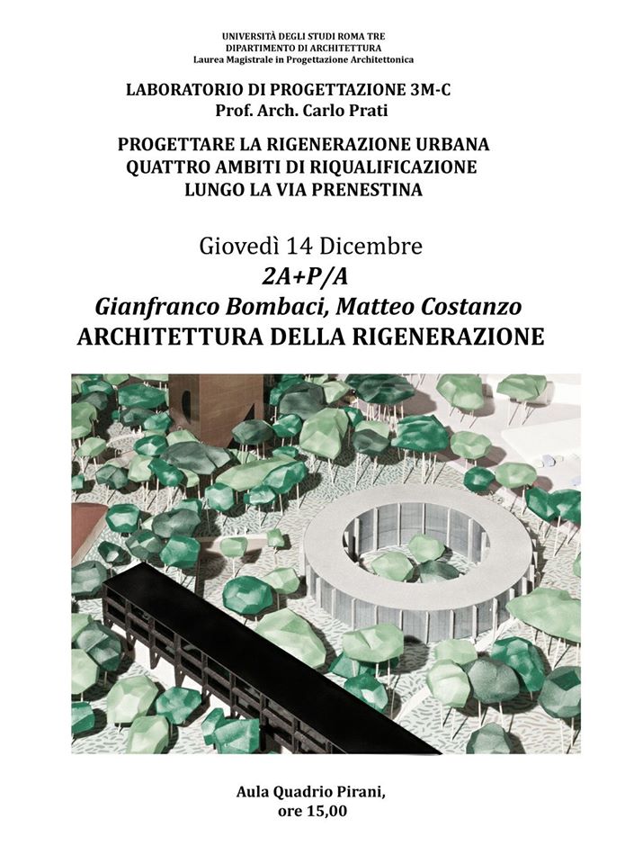 Locandine degli eventi organizzati e selezione foto riprese dagli Esami finali dai Laboratori in Progettazione urbana e architettonica che ho tenuto nella Facoltà di Architettura di Roma 3 all’ultimo anno sia del corso di Laurea Magistrale che in Scienze dell’Architettura. Il tema proposto è la Rigenerazione Urbana a Roma in particolare: per il lab 3M-C “Progettare la rigenerazione urbana. Quattro ambiti di riqualificazione lungo la via Prenestina” ha individuato come approfondimento alla scala dell’edificio 4 scenari operativi e 20 siti di progetto interpretati quali paradigmi della condizione di forte instabilità in cui si trova la città contemporanea. Il percorso didattico si è proposto di verificare attraverso gli strumenti del progetto l’attualità delle ricerche sulla formazione della città vista come sommatoria di parti eterogenee condotte a partire dagli anni sessanta da Aldo Rossi e Carlo Aymonino e di verificarne l’applicabilità nell’ambito di un progetto di rigenerazione alla scala urbana. Per il 3C “Progettare la rigenerazione urbana. Recupero dell’ex rimessa Atac “Vittoria” / tutor Onorato Di Manno (SET Architects) e Valeria Guerrisi (Warehouse of Architecture and Research) /