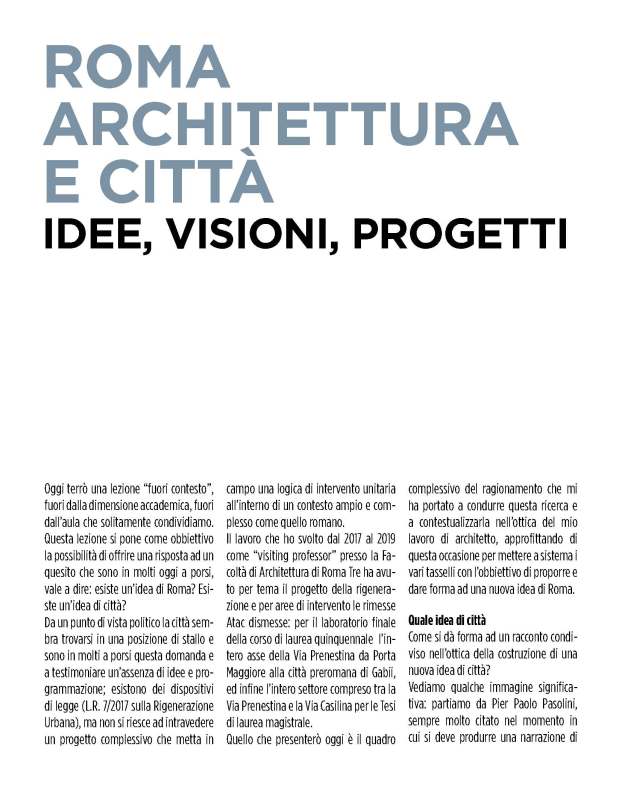 “Oggi terrò una lezione “fuori contesto”, fuori dalla dimensione accademica, fuori dall’aula che solitamente condividiamo. Questa lezione si pone come obbiettivo la possibilità di offrire una risposta ad un quesito che sono in molti oggi a porsi, vale a dire: esiste un’idea di Roma? Esiste un’idea di città? Da un punto di vista politico la città sembra trovarsi in una posizione di stallo e sono in molti a porsi questa domanda e a testimoniare un’assenza di idee e programmazione; esistono dei dispositivi di legge (L.R. 7/2017 sulla Rigenerazione Urbana), ma non si riesce ad intravedere un progetto complessivo che metta in campo una logica di intervento unitaria all’interno di un contesto ampio e complesso come quello romano. Il lavoro che ho svolto dal 2017 al 2019 come “visiting professor” presso la Facoltà di Architettura di Roma Tre ha avuto per tema il progetto della rigenerazione e per aree di intervento le rimesse Atac dismesse: per il laboratorio finale della corso di laurea quinquennale l’intero asse della Via Prenestina da Porta Maggiore alla città preromana di Gabii, ed infine l’intero settore compreso tra la Via Prenestina e la Via Casilina per le Tesi di laurea magistrale. Quello che presenterò oggi è il quadro complessivo del ragionamento che mi ha portato a condurre questa ricerca e a contestualizzarla nell’ottica del mio lavoro di architetto, approfittando di questa occasione per mettere a sistema i vari tasselli con l’obbiettivo di proporre e dare forma ad una nuova idea di Roma.”