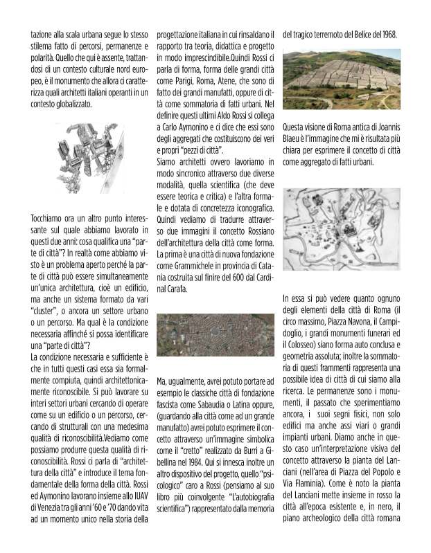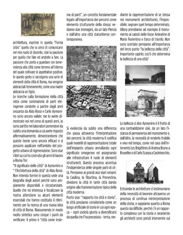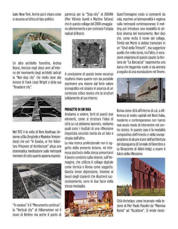 Uno sguardo su Roma attraverso una prospettiva duplice, progettuale ed utopica, a partire dai disegni di architettura a dai collage, visti quali campo di sperimentazione necessario per la prefigurazione di scenari concreti sviluppati successivamente nel corso dell’attività didattica, di ricerca e professionale.