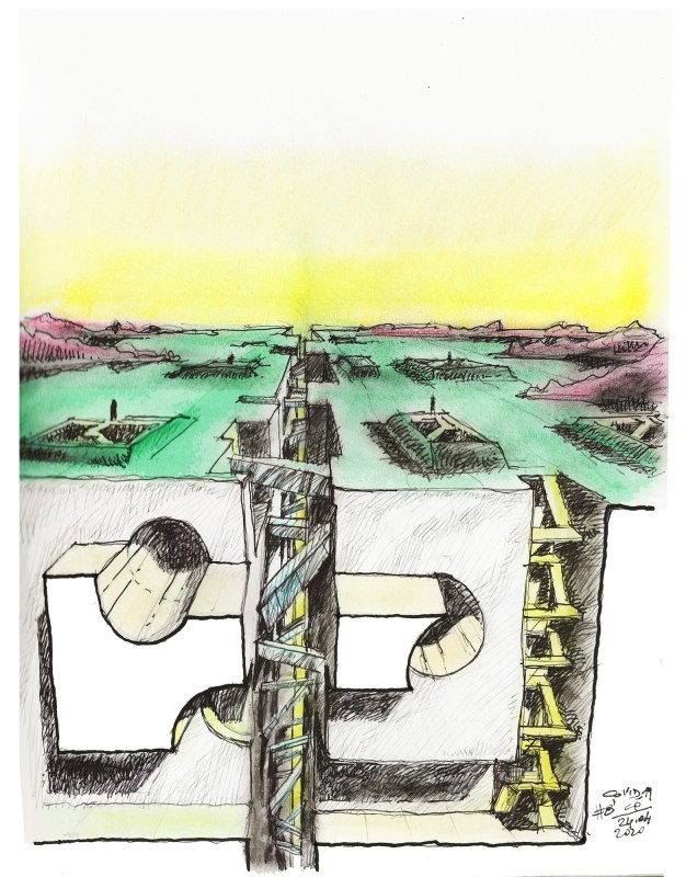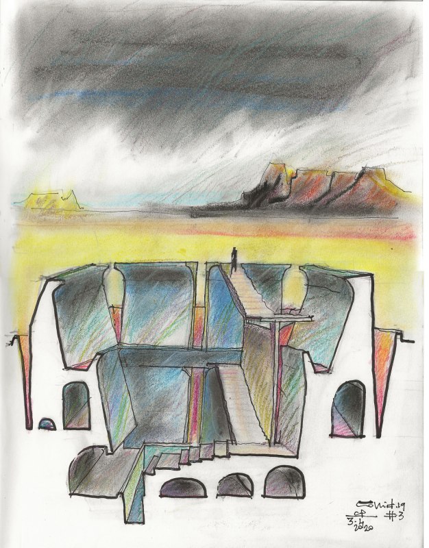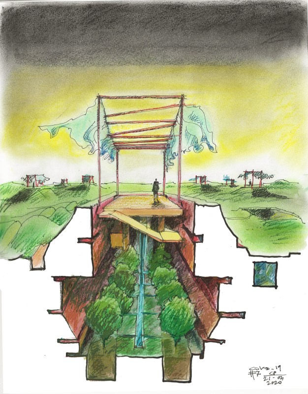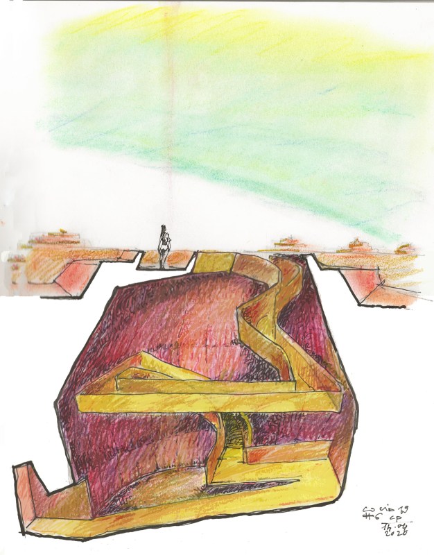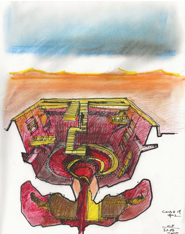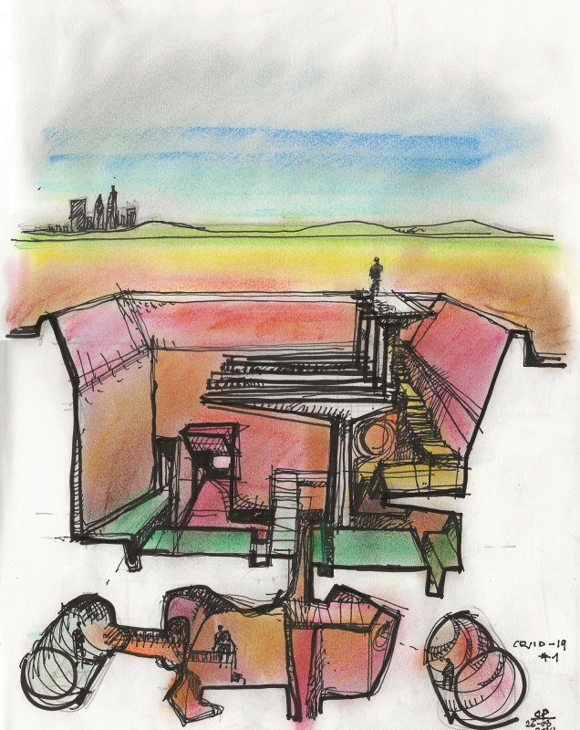 Disegno come progetto al tempo della pandemia Covid-19: questo senso di vuoto personale prodotto da una condizione di solitudine simultaneamente individuale e collettiva è il significato simbolico nascosto nel disegno “House with Two Horizon” che Raimund Abraham realizza nel 1973 per Kurt Kalb. Alla rilettura dello stesso sto dedicando una serie di disegni che riflettono sulla possibile costruzione di un nuovo concetto di architettura del (e nel) paesaggio