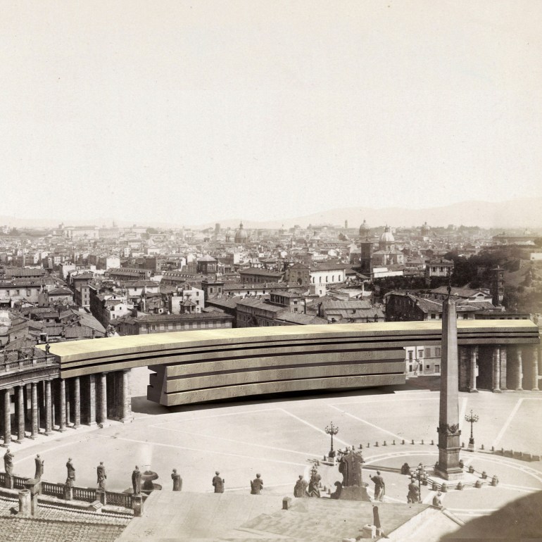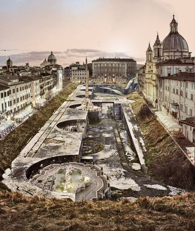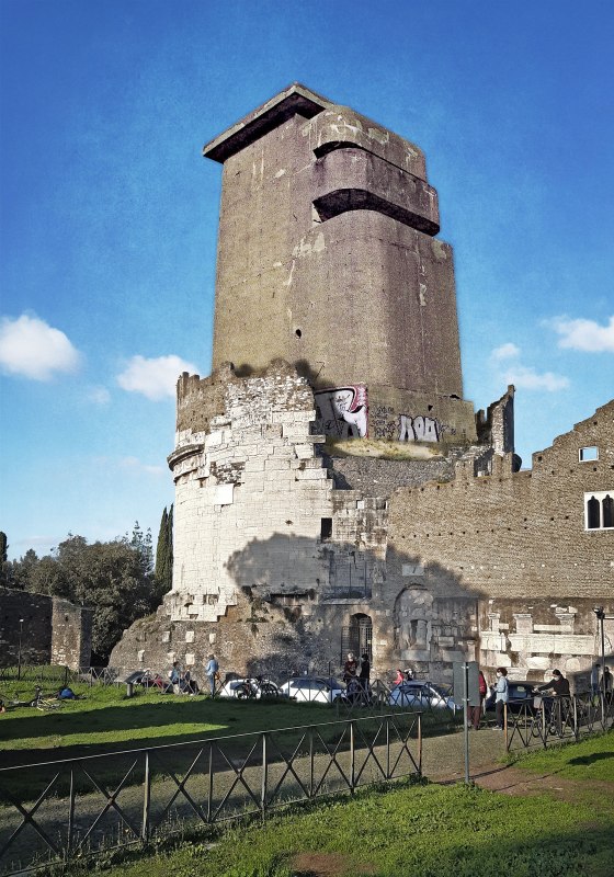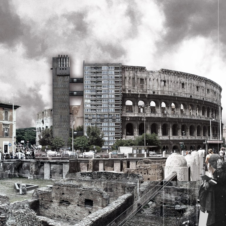 È questo l’obbiettivo tematico della serie di collage Roman Bunker Archeology: evidenziare il primato dell’oggetto sul funzionalismo ed allo stesso tempo lasciare emergere la molteplicità degli usi della nuova configurazione. Costruire sul costruito e dialogare, attraverso la rovina e l’opera d’architettura con il passato (il Rinascimento ed il Barocco), è un altro tema che desidero portare all’attenzione con i miei collages, nutrendo la convinzione che le discipline del restauro, del disegno e del progetto possano e debbano dialogare nel comune intento di formare una nuova e più attuale visione dell’architettura contemporanea da trasmettere ai nostri futuri e giovani architetti.