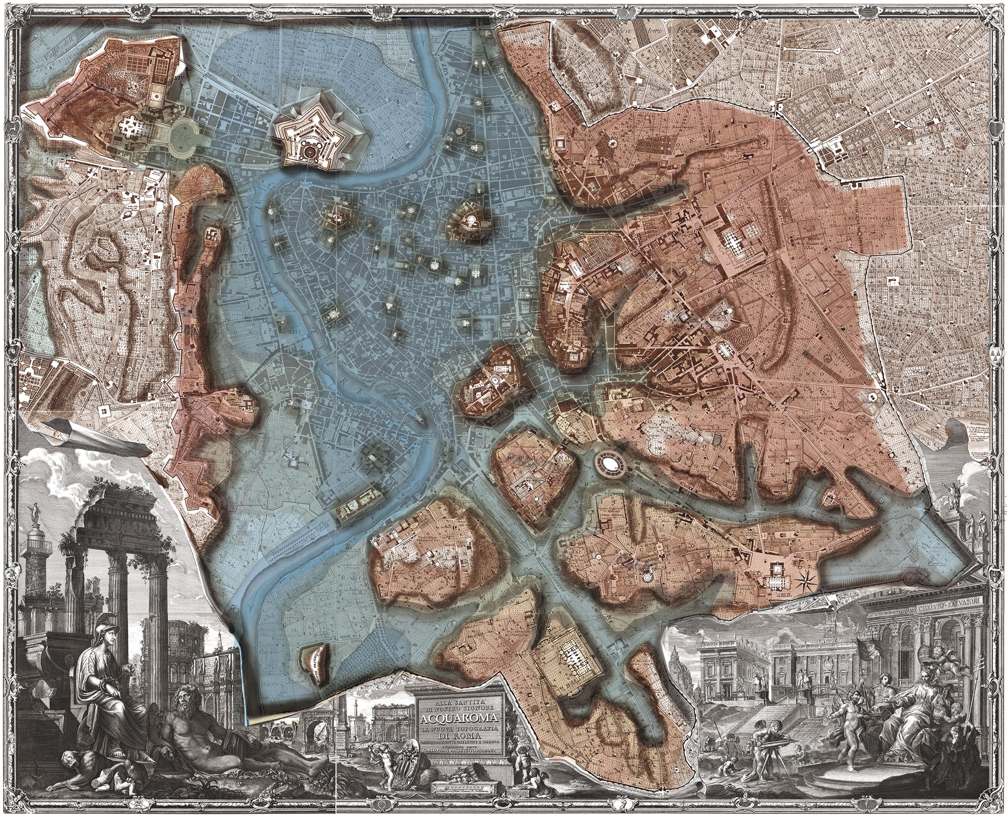 ACQUAROMA si costruisce inoltre a partire da poche ma essenziali domande legate alla ricerca che l’autore sta conducendo sull’ Architettura oltre la fine del mondo: Quale sarà l’immagine di Roma al tempo dell’Antropocene? Quale effetto produrrà sui monumenti della città l’innalzamento del livello dell’acqua dovuto al riscaldamento globale? Possiamo considerare l’emergenza climatica come un’opportunità per dialogare e convivere con il non umano che incombe su di noi?